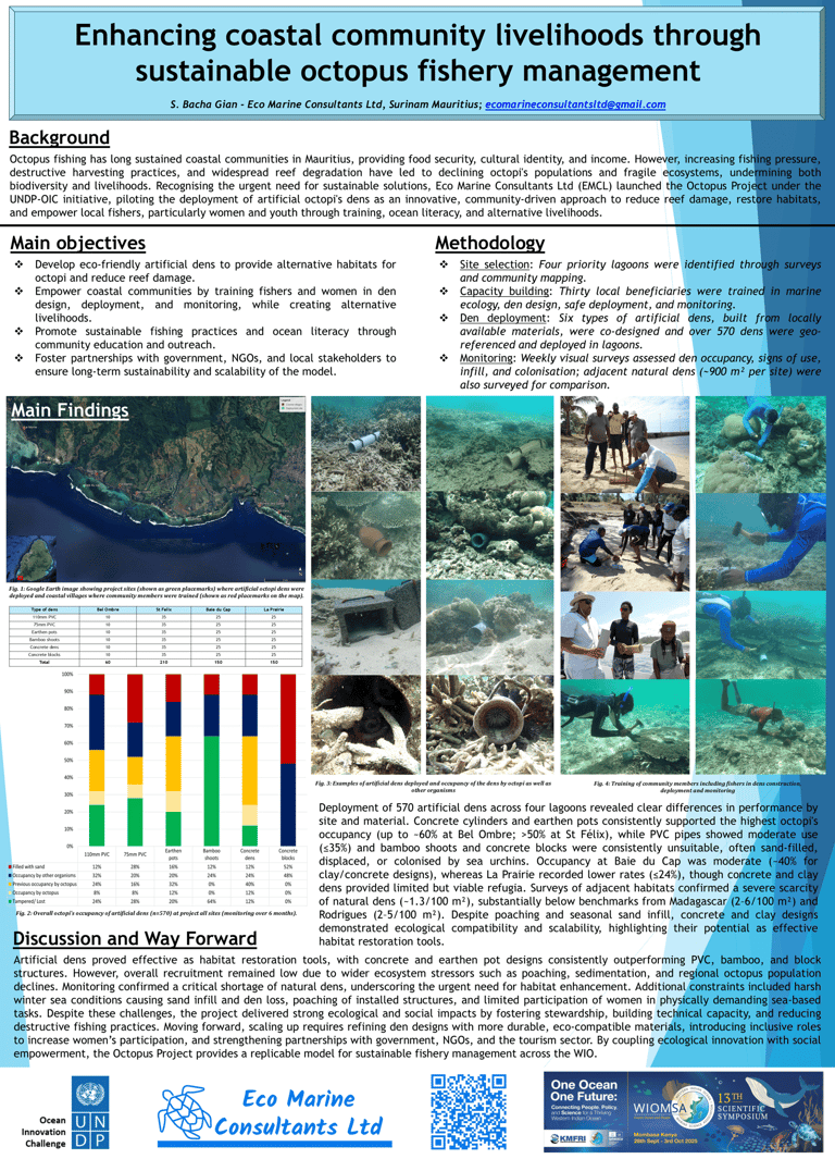 Coastal communities in Mauritius rely heavily on octopus fishing as a primary source of income. However, traditional fishing practices—particularly the breaking of coral reefs to extract octopi—have led to significant degradation of coral reef ecosystems, threatening biodiversity and long-term fishery sustainability. The Octopus Project was designed as an integrated solution to: